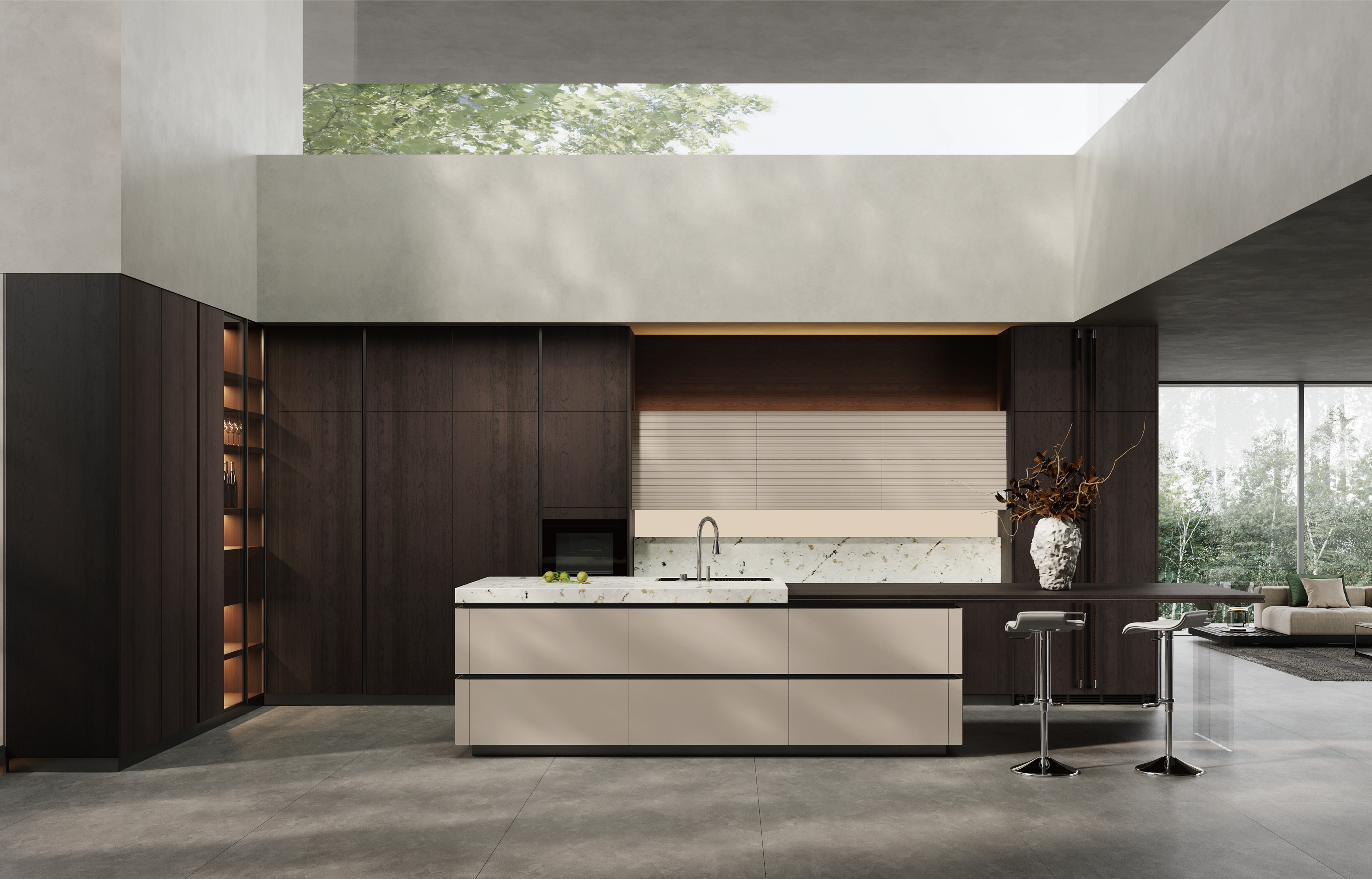 在厨柜设计中,地柜是采用抽拉方式,而吊柜采用的是平开方式,从设计美学来说,地柜是横线条,吊柜是竖线条,归纳为“地横吊竖